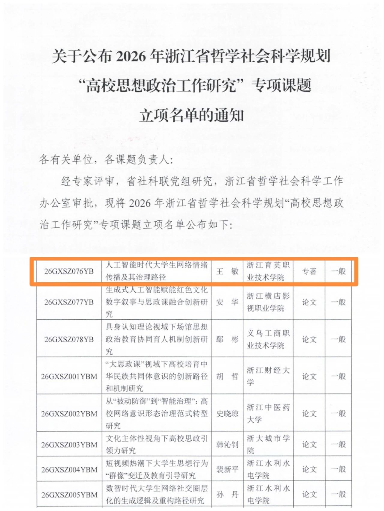 近日,浙江省哲学社会科学工作办公室公布了2026年浙江省哲学社会科学规划“高校思想政治工作研究”专项课题立项名单。我校党委副书记、副校长王敏教授担任负责人,邬佳、王亦飞、孙钦、王姣、周舟等学工团队成员共同申报的《人工智能时代大学生网络情绪传播及其治理途径》课题成功立项 (编号:26GXSZ076YB),实现了我校学生工作在浙江省哲学社会科学规划“高校思想政治工作研究”项目上的突破。
