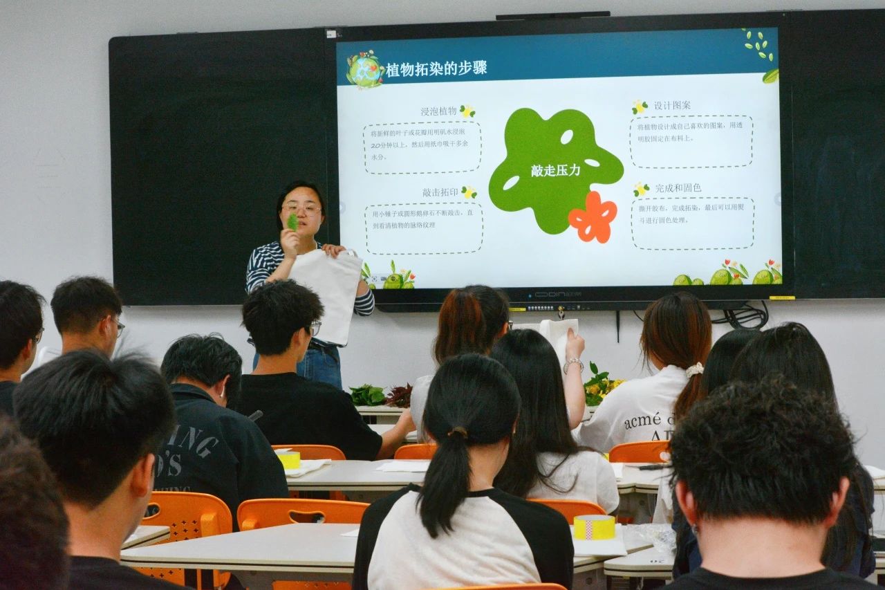 活动伊始,梅青青老师通过5分钟的“减压小课堂”,向同学们科普了压力管理的实用技巧与植物疗愈的科学原理。她指出:“自然与艺术是心灵的天然解药,专注创作的过程能帮助我们回归当下,释放焦虑。”简短的理论讲解为后续实践奠定了科学基础,也点燃了同学们对植物拓印的兴趣。