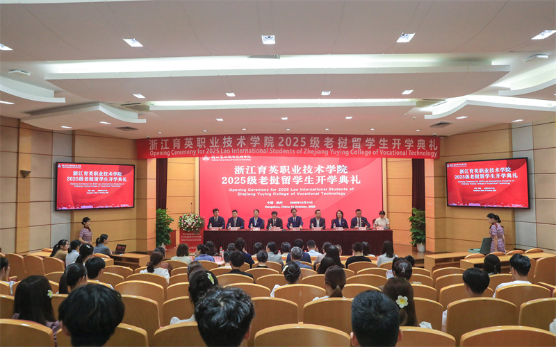 10月14日,2025级老挝留学生开学典礼在三楼报告厅举行。杭州市教育局高等教育处处长潘长青,老挝教育部职业技术教育司检查监控与评估处处长 MEUNMANY SANTIPHAP(蒙曼尼·桑蒂帕),校长丁金昌,常务副校长黄爱平,党委书记、副校长谢鑫,党委副书记、副校长王敏,副校长徐晓斌、严志嘉,智慧旅游学院、公共教学部、各行政部门负责人等出席,2025级、2024级老挝班全体学生、语伴学生、辅导员及相关师生代表参加。王敏主持开学典礼。
