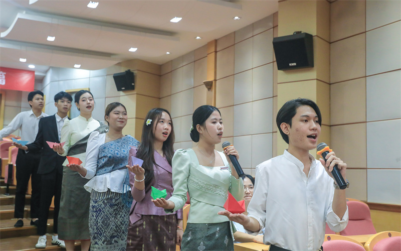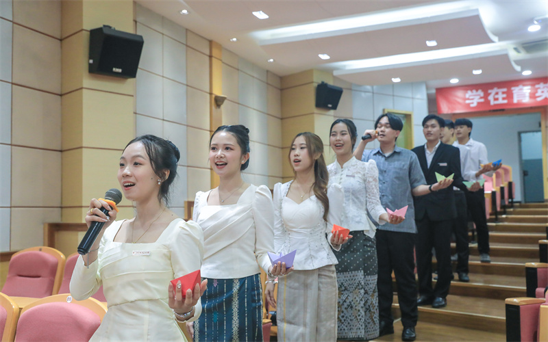 2024级老挝留学生进行主题展示,齐唱和朗诵《让我们荡起双浆》。