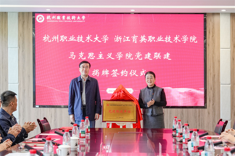 10月23日,两校马克思主义学院党建联建揭牌签约仪式在杭职大马克思主义学院举行。杭职大党委副书记赖明诚,组织部部长韩亮、宣传部部长张杰、马院党总支书记、院长邹宏秋,我校党委书记、副校长谢鑫,党委委员、党群部部长王贤军,马院党总支书记、院长陈贤平出席,两校马院全体教师参会。韩亮主持会议。