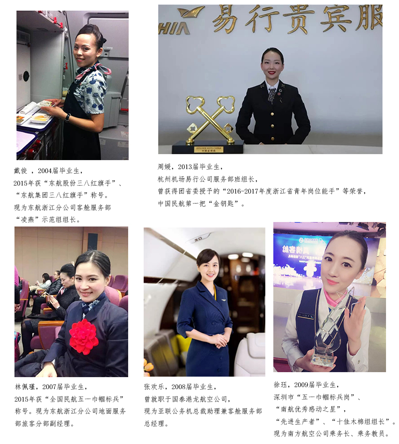 空乘专业优秀校友层出不穷,社会影响力大。据统计,目前毕业生中百余人任各大航空公司客舱服务部经理以上,上千人为乘务长以上骨干,涌现出一大批行业先进人物。