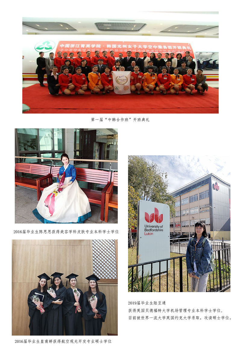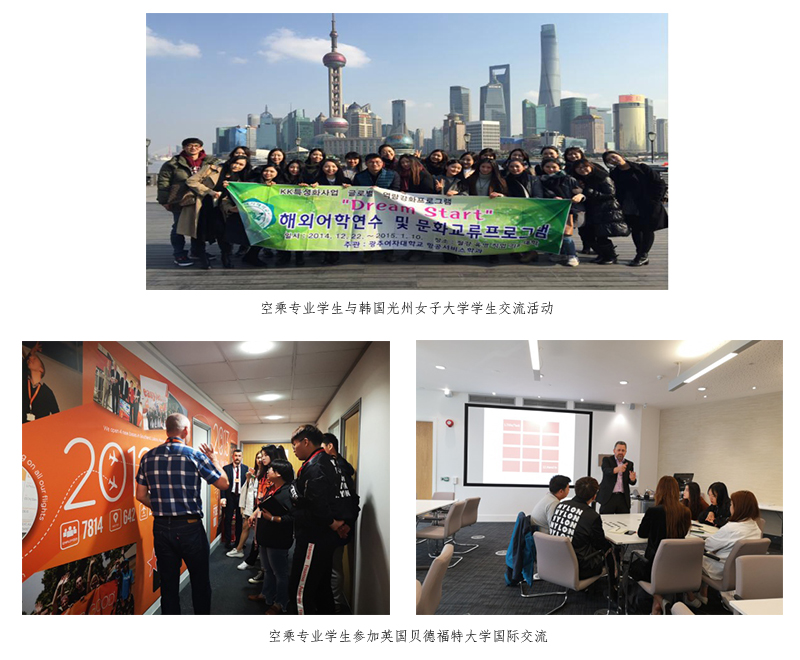 学院与韩国光州女子大学、英国贝德福特大学联合培养空中乘务专业学生,可选择攻读本科、研究生学历。