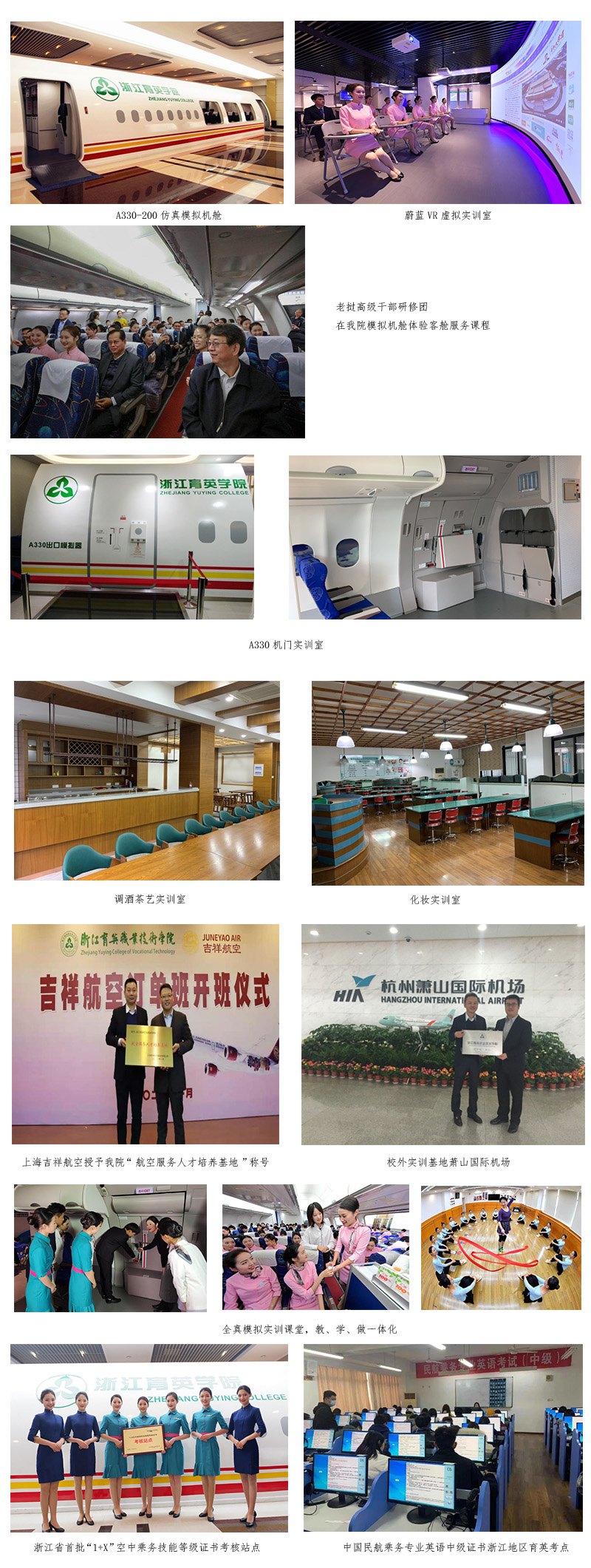 空中乘务专业拥有先进完备的实训条件,拥有A330仿真模拟机舱、A330机门实训室、调酒茶艺实训室、化妆实训室等8个校内实训基地以及国航、东航、吉祥航空、长龙航空、厦航、川航、萧山国际机场等40余家紧密型校外实训基地。专业校企紧密合作,共同构建集认知实训、综合实训、顶岗实习和就业实习为一体的实训教学模式。我院是浙江省首批“1+X”空中乘务职业技能等级证书考核站点,中国民航乘务专业英语中级证书浙江地区考点。