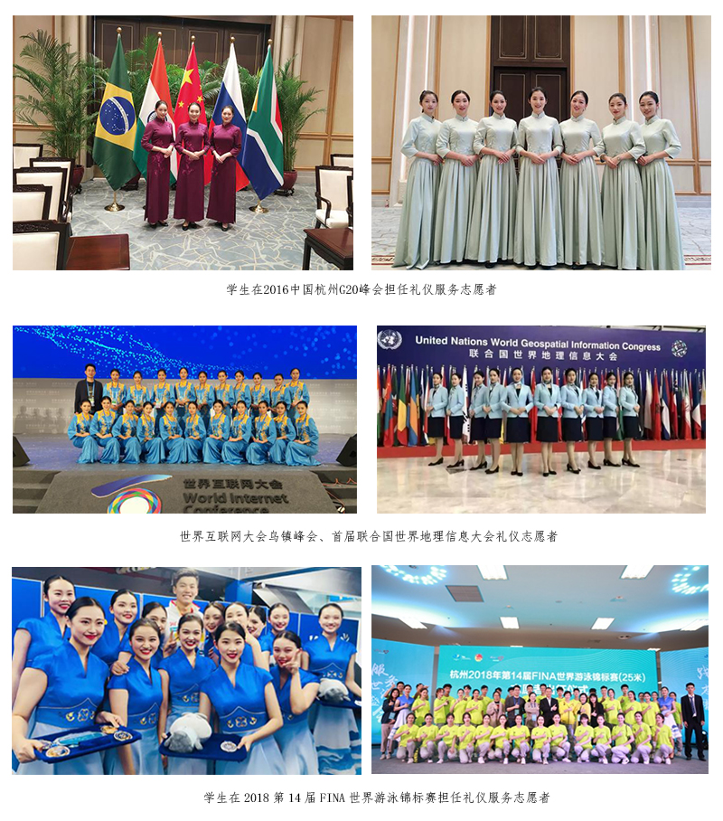 空中乘务专业学生承担G20峰会、世界互联网大会乌镇峰会、联合国世界地理信息大会、世界游泳锦标赛、浙江省两会、党代会等全国及省市重大活动礼仪服务志愿者工作,向社会展示了良好的专业形象和综合素质。