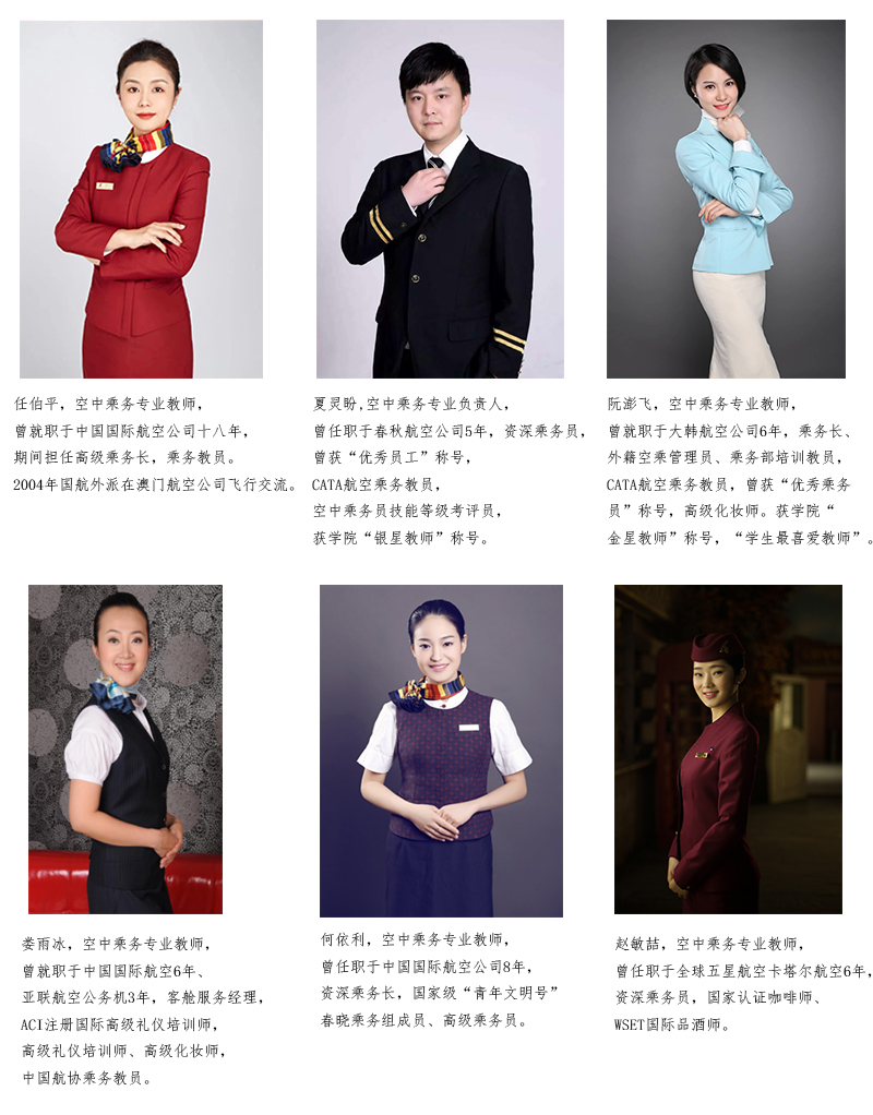 专业教师来自国航、东航、海航、港龙航空、大韩航空等国内外知名航空公司的资深教员、乘务长、乘务员以及取得航空乘务教员资格的教师组成,具备丰富的飞 行经验、操作技能和教学经验。