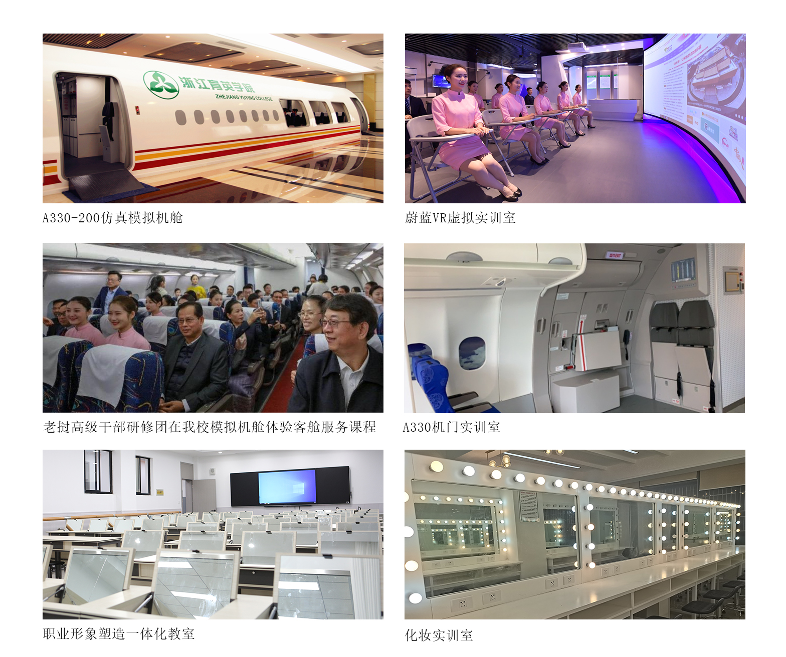 空中乘务专业拥有先进完备的实训条件,拥有A330仿真模拟机舱、A330机门实训室、调酒茶艺实训室、化妆实训室等8个校内实训基地以及国航、东航、吉祥航空、长龙航空、厦航、川航、萧山国际机场等40余家紧密型校外实训基地。专业校企紧密合作,共同构建集认知实训、综合实训、顶岗实习和就业实习为一体的实训教学模式。我校是浙江省首批“1+X”空中乘务职业技能等级证书考核站点,中国民航乘务专业英语中级证书浙江地区考点。