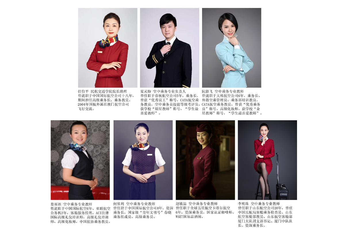 专业教师来自中国国际航空、山东航空、春秋航空、澳门航空、卡塔尔航空、大韩航空、亚联公务机等国内外知名航空公司的资深教员、乘务长、乘务员以及取得航空乘务教员资格的教师组成,具备丰富的飞行经验、操作技能和教学经验。