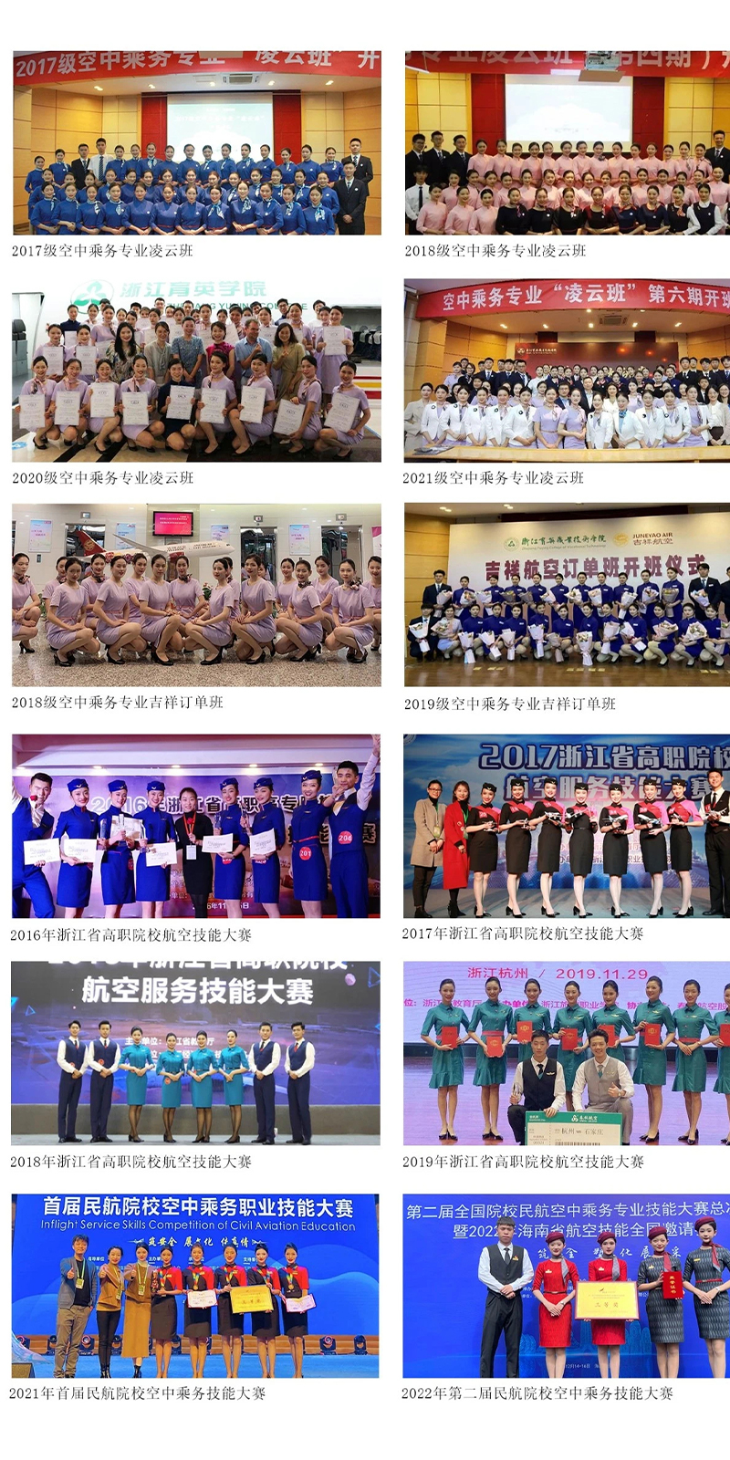 学校与吉祥航空合作开展的“岗赛课证创”多元融通空中乘务员培养工程入选2021年度浙江省职业院校产学合作协同育人项目;校企合作开设“吉祥航空订单班”,为航空公司培养优秀人才。2024年,学生竞赛团队获得中航协民航院校空中乘务技能竞赛全国二等奖、空中乘务技能竞赛华东区一等奖、长三角航空服务礼仪竞赛一等奖等。学校成功承办了第四届中航协全国院校空中乘务技能竞赛华东赛区复赛,获得业内广泛好评。