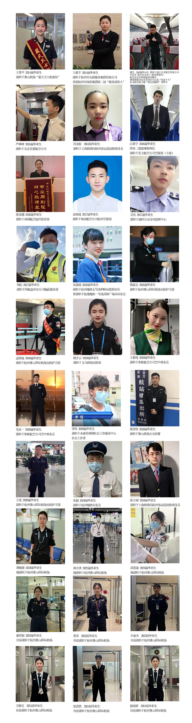 本专业毕业生可从事机场、航空公司、航空货运站等单位的安检及地勤、空中乘务(安全员方向)、航空运输安全管理,巡特辅警,高铁、地铁、港口、长途客运、物流、邮局、海关及重要场馆的安全检查及相关管理岗位。浙江省机场集团在十四五期间重点打造世界一流的“多式联运”空港综合交通枢纽、服务“一带一路”的国际航空枢纽,目前我校与省内各机场建立了全面的校企合作关系,共推进人才培养项目的实施与开展。同时浙江省已成为我国少数已建成高铁里程超过普速铁路的省份之一,特别是杭州、宁波、温州、绍兴等地的城市轨道交通相继开通,高铁安检、地铁安检巨大的人力资源缺口为安检专业学生提供了广阔的就业空间。