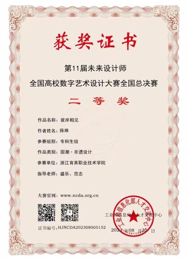 22形象A班陈琳同学获得第11届未来设计师全国高校数字艺术设计大赛全国总决赛二等奖