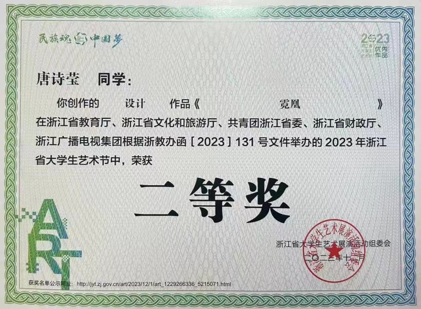 22形象A班唐诗莹同学获得2023浙江省大学生艺术节展演设计类二等奖