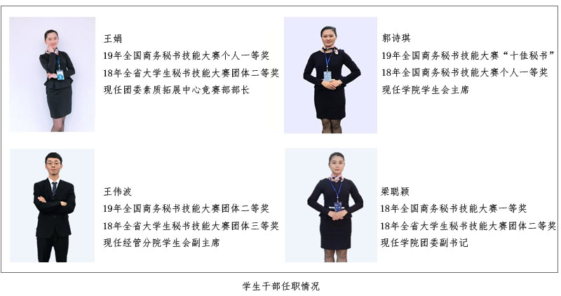 专业学生拥有优异的专业竞技成绩和校内团学工作成效,为学生从“高级秘书”向“管理者”转变提供职业生涯规划训练平台,助力职业发展成功。